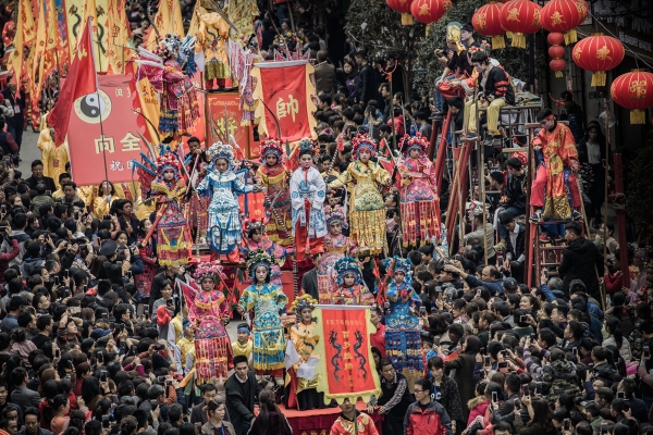 今年元宵节,长乐古镇6岁孩童身着红绸金甲,脚踏“风火轮”,凌空立于高台之上,灵动演绎哪吒的英姿;“五一”期间,铁花漫天飞舞,高跷艺人踏歌而行,千年麻石街变身非遗秀场。
