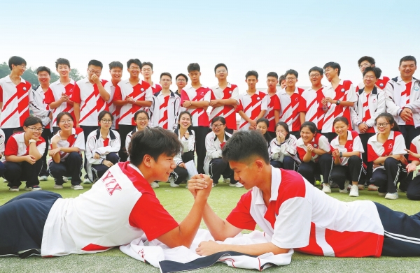 5月27日,衡山县岳云中学,高三学生在运动场比赛掰手腕。高考临近,该校组织高三年级学生开展丰富多彩的趣味游戏运动,让他们以轻松、乐观、自信的心态迎接高考。