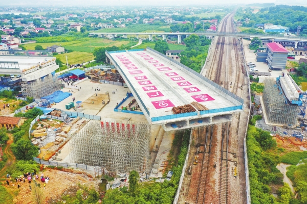 5月27日,经过85分钟紧张有序施工,由中铁二十五局承建的暮坪湘江特大桥跨京广铁路转体桥在空中精准“转身”84.9度,顺利完成转体对接。此次转体的桥梁全长110米,桥面宽28.2米,总重量达1.36万吨。该桥采用“先平行铁路支架现浇,后平面转体”的方法,最大限度减少对既有线路的干扰。桥体以每分钟1.15度的速率平稳旋转,最终实现与两侧引桥的毫米级误差对接。