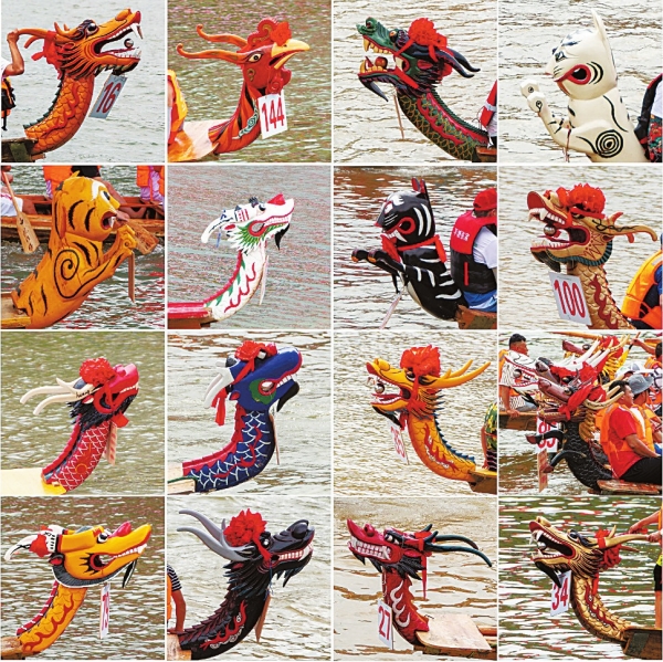 与外地龙船不同的是,道州龙船不是清一色的龙头造型,它有“龙、虎、凤、麒麟”四大类。即便是相同的“祥兽”,也会有不同的颜色,比如龙有金龙、黄龙、乌龙、青龙、白龙、赤龙六种样式,而虎有金虎、黄虎、红虎、白虎、黑虎五种区别。相同的“神兽”还会有不同的神态,比如龙虎就有“咂嘴”“抿嘴”两种,而凤全是抿嘴的,麒麟全是咂嘴的。这些不同造型的出现,根源在于道州龙船的船头代表着一村一坊或一姓一域一族的信仰与习俗,正所谓“庙生龙,龙生庙”,像乌龙庙对应乌龙头,黄龙庙衍生黄龙头。
