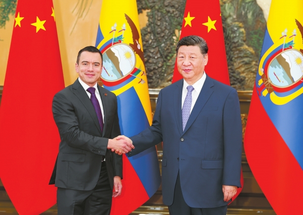习近平指出,今年是中厄建交45周年,两国关系发展势头良好。厄瓜多尔加入共建“一带一路”大家庭,双方签署自由贸易协定,在能源、矿业、电力、基础设施建设等领域开展了富有成效的合作。中方始终从战略高度和长远角度看待和发展中厄关系,愿同厄方一道努力,推动中厄全面战略伙伴关系不断走深走实,更好造福两国人民。