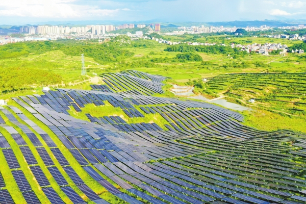 6月30日,嘉禾县珠泉镇平世村,光伏发电场与青山绿地相互映衬,蔚为壮观。近年来,该县坚持生态优先、绿色发展的理念,充分利用荒山、坡地发展光伏产业,助力当地经济发展。