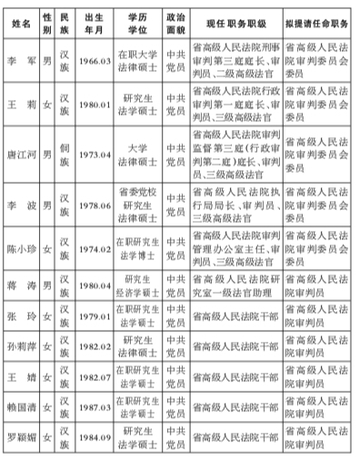 为进一步加强对省高级人民法院提请省人大常委会任命人员的监督,增强其公信力和群众基础,现对拟提请省人大常委会任命审判职务的人员进行任前公示: