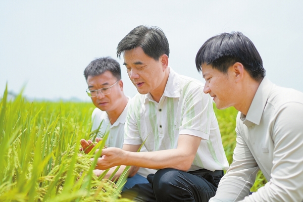 看着眼前这片稻田,中国工程院院士、湖南省农科院党委书记柏连阳露出满意的笑容,并给一旁的院士团队成员、湖南杂交水稻研究中心副研究员李建武竖了个大拇指。“植株挺拔,谷粒充实,看来孕穗期这片田被照顾得很好。”柏连阳说。