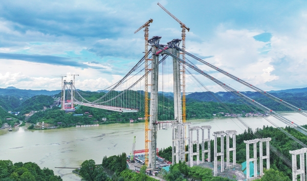 7月1日,位于沅陵县清浪乡的洞庭溪沅水特大桥项目,正在紧张施工。该大桥由湖南路桥建设集团公司承建,是国家高速公路网纵向主干线呼北高速张(家界)官(庄)段控制性工程之一,大桥全长1707米,主跨800米双塔单跨悬索桥,跨越沅水和五强溪国家湿地公园,是湖南省在建最大跨径悬索桥。