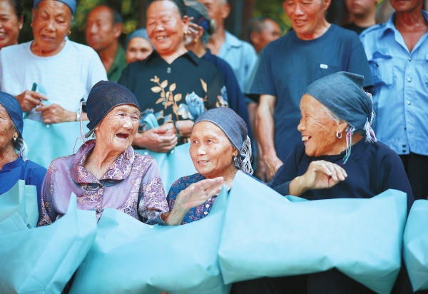 7月5日,通道侗族自治县双江镇向晖村,收到生活物资的老人们开心不已。当天,该县民政部门联合北京微爱公益基金会、怀化志愿者协会等公益组织,为该村150余名留守及困难老人赠送了夏凉被、牙膏、毛巾等物资,用实际行动关爱老人。
