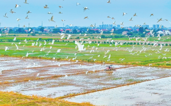7月17日,岳阳市屈原管理区河市镇,村民驾驶农机开展翻耕作业,成群鹭鸟环绕伴飞,构成一幅人与自然和谐共处的生态画卷。