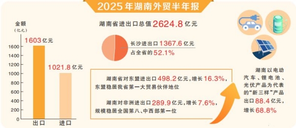 出口目的地多元化缓解了贸易摩擦带来的压力。上半年,湖南省对东盟进出口498.2亿元,增长16.3%,东盟稳居我省第一大贸易伙伴地位。对中东国家进出口181.2亿元、增长11%,中东已成为我省仅次于东盟、非洲、欧盟的重要贸易经济体。