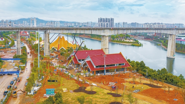 7月22日,怀化市鹤城区东盟集项目施工现场一派忙碌景象。目前,该项目11个场馆、25个单体建筑均已完成主体结构施工。作为第五届湖南旅游发展大会重点配套项目,该项目计划7月底建成投用。