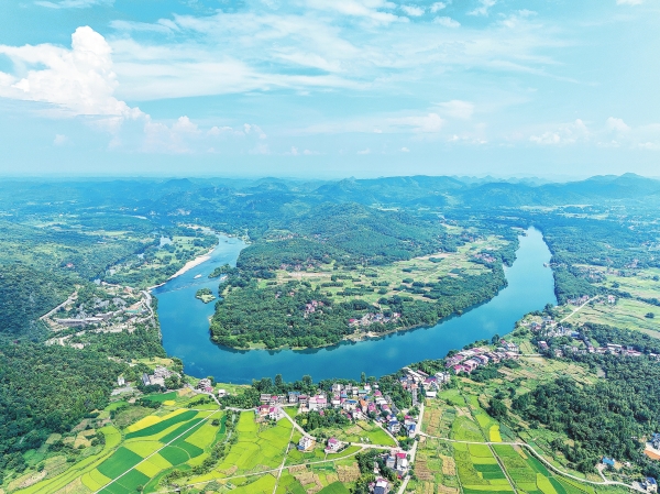 7月29日,东安县紫溪市镇,湘江沿岸青山苍翠,风景如画。近年来,该县坚持生态优先、绿色发展理念,严格落实河湖长制,实施水岸同治工程,持续修复湘江水生态,确保一江碧水出东安。
