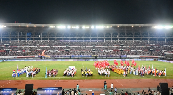 19时38分,“娄超”启幕,逾2万名身着球服、手持加油棒的球迷全力呐喊,为赛场球员助威。