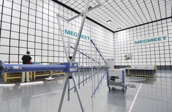 在研发中心10米法半电波暗室内,记者见证了一次中联重科高空作业车电磁辐射检测。测试过程中电磁辐射曲线图突然出现异常,工程师迅速诊断,现场提出解决方案:加装一个磁环。不到三分钟,磁环安装到位,曲线图恢复正常。