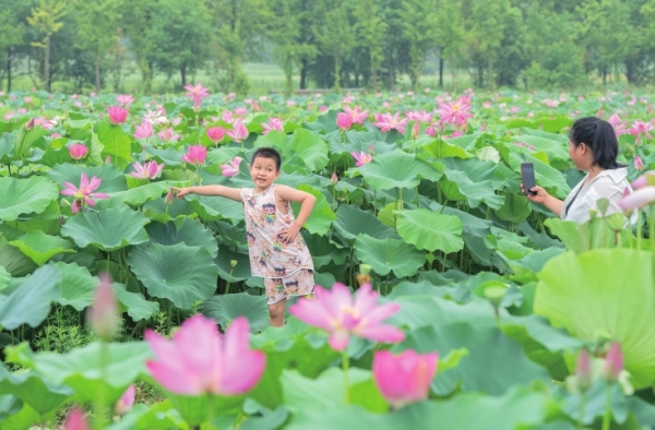 7月29日,游客在耒阳市永济镇大河边村荷花种植基地观光打卡。近年来,当地依托良好的自然生态环境,积极做活“水”文章,推广种植湘莲120余亩,提高村民收入,助力乡村振兴。