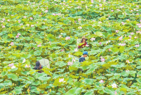 7月29日,耒阳市永济镇大河边村荷花种植基地,村民在采摘莲蓬。均为湖南日报全媒体记者 李健 摄