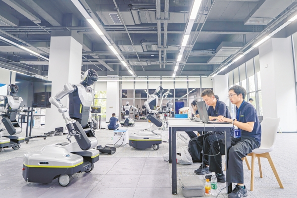9月11日,湖南湘江新区世界计算·长沙智谷机器人体验中心,技术人员正对机器人进行全方位调试检测,为将于14日开幕的2025互联网岳麓大会做准备。
