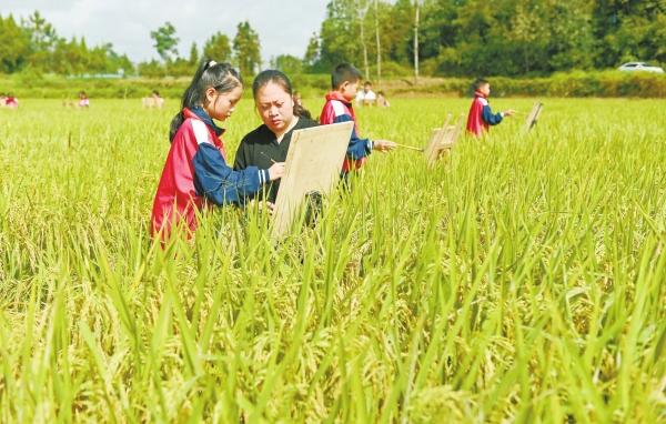9月11日,学生在稻田写生。当天,洞口县杨林镇中心小学开展“寻找最美秋天”户外活动,让学生用画笔描绘丰收美景。