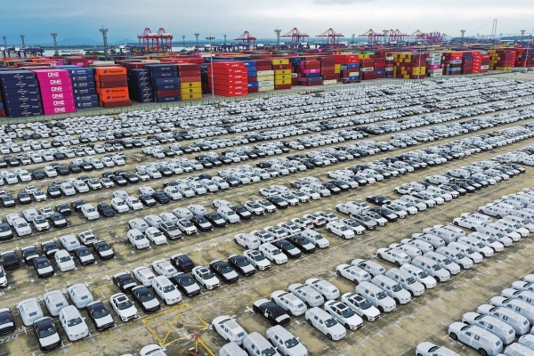 图为大批汽车在江苏省港口集团南京港龙潭港区准备装船出口(9月8日摄,无人机照片)。