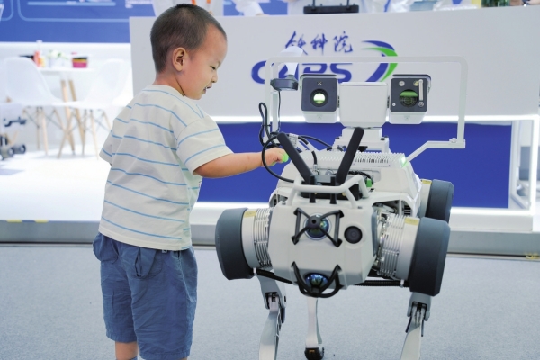 9月14日,2025年中国国际服务贸易交易会在北京落下帷幕。图为当日,小朋友在环境服务专题展区与机器狗互动。