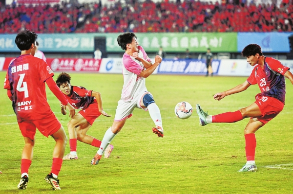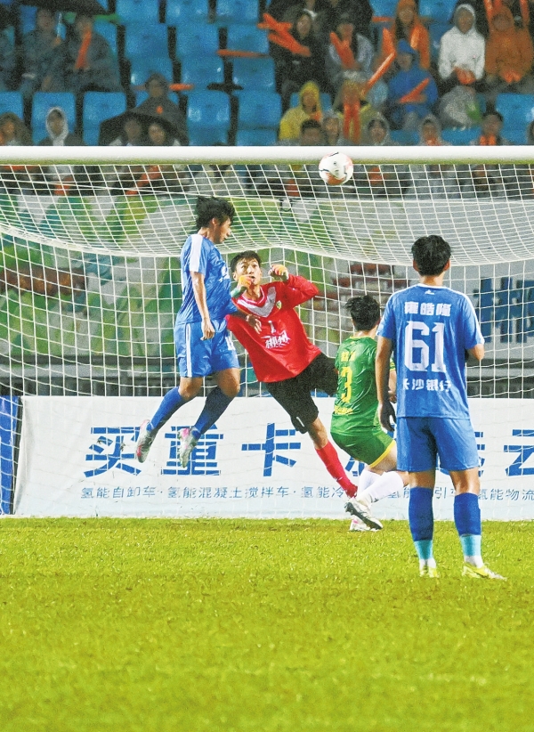 9月20日晚,郴州市体育中心,两队球员在比赛中奋力拼抢。当天,2025湖南省足球联赛(简称“湘超联赛”)郴州队坐镇主场迎战长沙队,最终双方0比0战平。陈哲君 摄(湖南图片库)