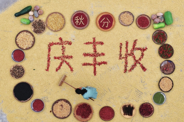 9月22日,嘉禾县晋屏镇泉凤村,村民用辣椒、玉米等农作物拼出“庆丰收”字样,喜迎第八个“中国农民丰收节”。