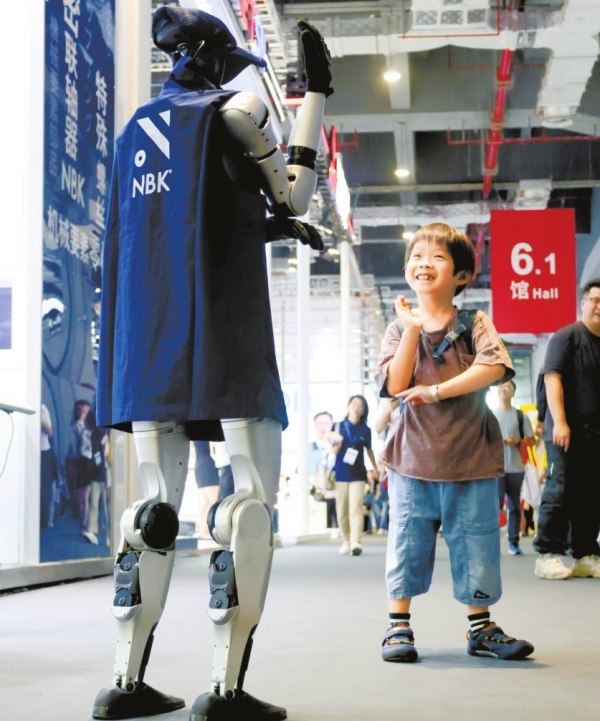 9月23日,第25届中国国际工业博览会在国家会展中心(上海)开幕。本届工博会吸引来自全球28个国家和地区的近3000家企业参展。图为当日小朋友在展会现场与人形机器人互动。
