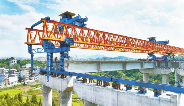 10月2日,新田县龙泉街道石甑源村,桂(东)新(田)高速桂阳至新田(宁远)段建设现场,工人在进行桥梁施工作业。