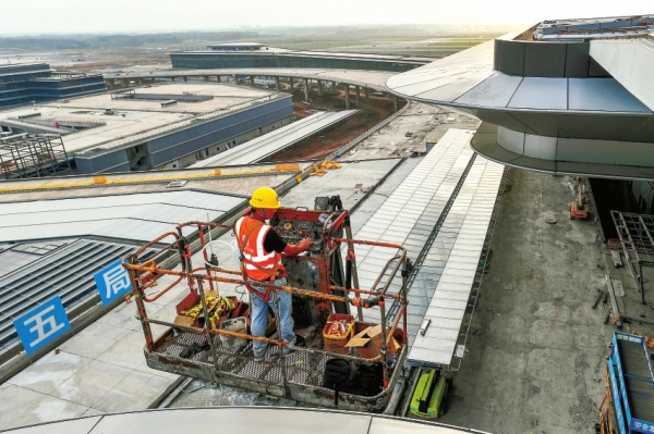 10月2日,长沙机场T3航站楼改扩建工程施工现场,中建五局不二幕墙公司工人在进行吊顶胶条安装作业。湖南日报全媒体记者 辜鹏博 摄