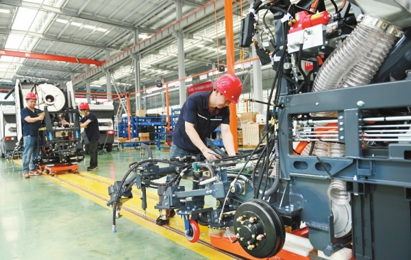 10月2日,洞口经济开发区纽恩驰(湖南)环境产业有限公司,工人在生产新能源环卫车。滕治中 摄(湖南图片库)