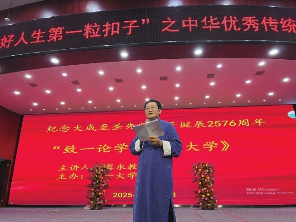 9月28日,孔子诞辰2576周年之际,致一大学堂受邀走进益阳市朝阳学校开展孔子日活动。以一场主题为《大学》经典的传统文化讲座,为师生们带来了一场浸润心灵的文化盛宴,让儒家经典智慧在校园中焕发新活力。讲座中,致一大学堂创始人窦永教授以“大”立心,用“学”践行,让传统文化在现代社会焕发新的活力,引导学生和老师追求更高的人生境界和社会价值。《大学》的“大”不仅是“事大理大”的意思,更是代表着一种崇高的追求,一种博大的胸怀,以及一种普遍的价值观,是儒家思想的核心体现。“学”字则体现了两种次第。第一个次第是“当下顿悟、一听就懂”,第二个次第是强调“学、问、思、辩、修、行、证”的递进过程。学生不仅要学习知识,还要提出疑问,要深入思考,要辩证认知,还要修持认知,要行持认知,最后将所学转化为成果,积淀为人格。从“明德”到“亲民”,最终实现“止于至善”。这种学习不是简单的知识积累,而是一种人格的塑造,通过实践将知识内化为行动指南,真正将教育部的“立德树人”落实到了实处,为全国师生开启了“立德树人”的标准。