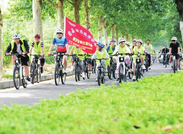 10月5日,澧县澧浦街道黄沙湾社区屈原路,亲子骑行队伍正快乐行进。当天,澧县捷安特骑行俱乐部组织6至12岁儿童及其家长开展亲子骑行活动,以健康运动的方式共庆国庆中秋佳节。