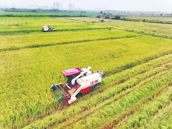 10月8日,澧县澧南镇刘市社区,农民驾驶收割机收割晚稻。时下,该县种植的早熟晚稻品种陆续进入成熟期,当地全面启动晚稻机收工作,确保丰收。