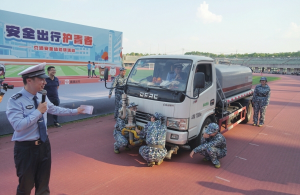 10月9日,中南大学体育场,长沙交警通过货车盲区演示,提醒学生注意道路安全。当天,长沙交警与中南大学联合开展“开启安全新学期 守护青春每一步”交通安全宣传活动,通过“交通标语你比我猜”“盲区体验”“戴头盔比赛”等多个趣味互动环节,提升学生交通安全意识与自我防护能力。