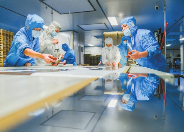 10月9日,道县高新区湖南沃玻科技有限公司,工人在触摸屏玻璃盖板生产流水线上作业。