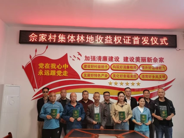 9月25日,绥宁县集体林地收益权证首发仪式在佘家村举行。现场村民们捧着崭新的收益权证和分红款欣喜说道:“以前只知道林子是集体的,现在不光有分红,还拿了证,以后的收益心里有底了!”