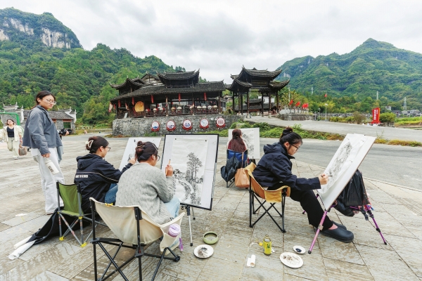 10月14日,吉首市矮寨镇坪朗村,河南科技大学美术学专业的学生在写生。近年来,该市扎实推进美丽乡村建设,传统村落得到有效保护,人居环境持续改善,吸引众多高校艺术学子前来写生创作。