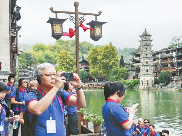 10月17日,香港嘉宾在凤凰古城参观。17日至20日,“湘港同心·文化同行”湘西与香港文化艺术交流活动,在湘西土家族苗族自治州举行。湖南日报全媒体记者 杨元崇 通讯员 朱开朗 摄影报道