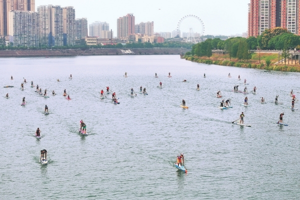 10月25日,衡阳市第三届桨板环东洲岛比赛在湘江水域举行。150名选手参与4.3公里环岛竞速,展现水上运动魅力。 曹正平 摄(湖南图片库)