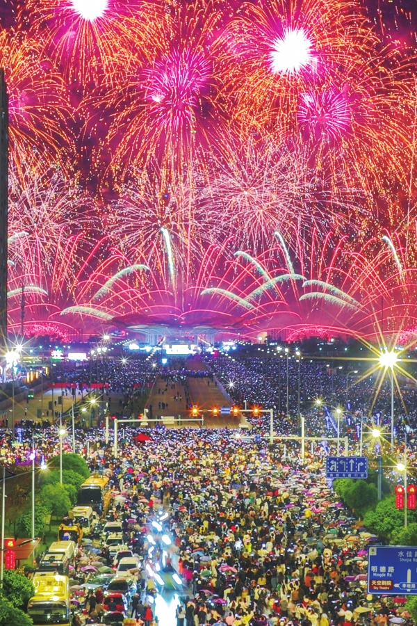 10月24日晚,第十七届浏阳花炮文化节在浏阳天空剧院开幕,160米高的“烟花光塔”点亮夜空。本届节会创新融合焰火艺术、科技创意与产业峰会等多元形式,全方位展现烟花产业的文化内涵与创新成果,推动传统工艺与现代科技的深度融合。 邓霞林 摄(湖南图片库)