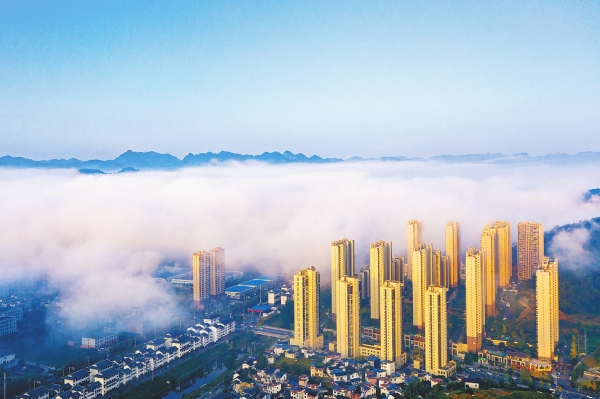 10月28日,湘西高新区迎来壮美云海景观,云雾如轻纱般笼罩城市,楼宇在云海中若隐若现,构成一幅“天上人间”的美丽画卷。