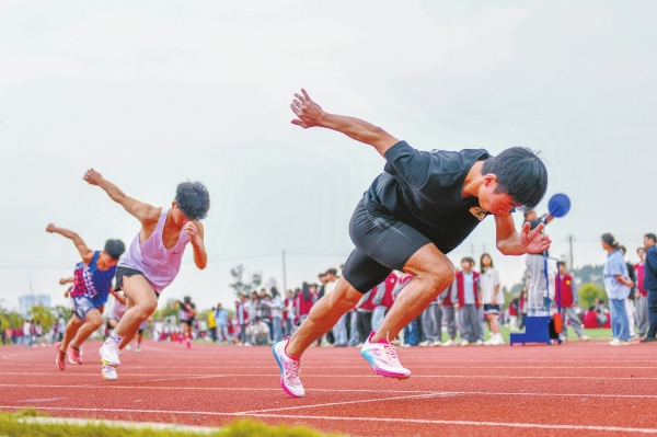 10月28日,学生在参加跑步比赛。当天,道县道州玉潭(东阳)学校举行秋季阳光体育运动会。