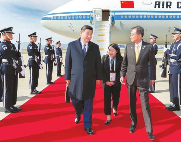 习近平抵达釜山金海国际机场时,韩国外长赵显等高级官员热情迎接。礼兵分列红地毯两侧致敬,军乐团演奏行进乐,机场鸣放21响礼炮。