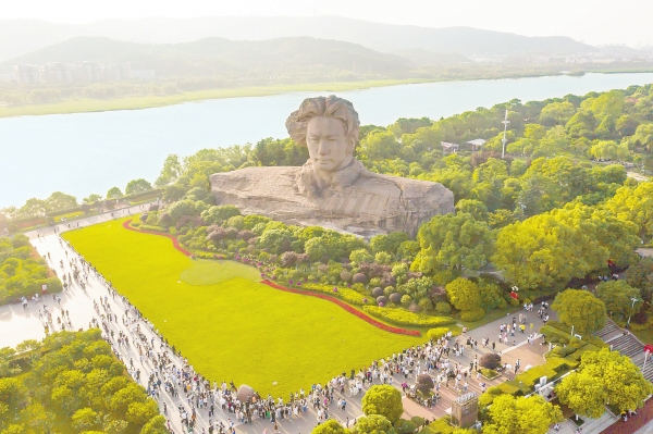 我仍然清楚地记得,2009年,毛泽东青年艺术雕像落成。暮秋的一天早晨,我来到橘子洲,幸福地感触着它,顿时浮想万千。回到家里写出了散文《守望橘子洲》,发表在人民日报副刊版。我在文中这样写道:“眼前如茵芳草,葱茏树木,诗意奇石,幽翠修篁,荡湖涟漪,陈色古阁,风华碑亭,无不激情飞扬,灵气浩然。这一切极其自然而亲切地被岳麓山高扬的紫雾,爱晚亭流泻的泉声,岳麓书院飘出的书香,乃至天心阁上的霞光,湘江波涛上的帆影,簇拥成一片豪情,一颗文魂,一轮红日。而现在矗立岛之东南位置的毛泽东青年艺术雕塑仍未改日出韶山时的风流和喷薄的神采,依然放射耀天暖地,滋润万物的璀璨霞辉。”