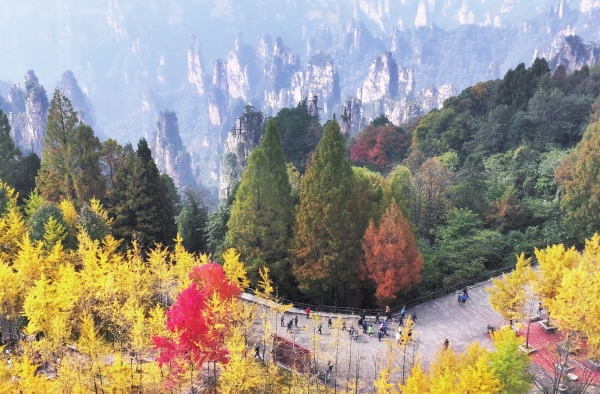 11月4日,张家界国家森林公园天子山景区,秋色斑斓,景美如画,吸引众多游客前来赏秋游玩。