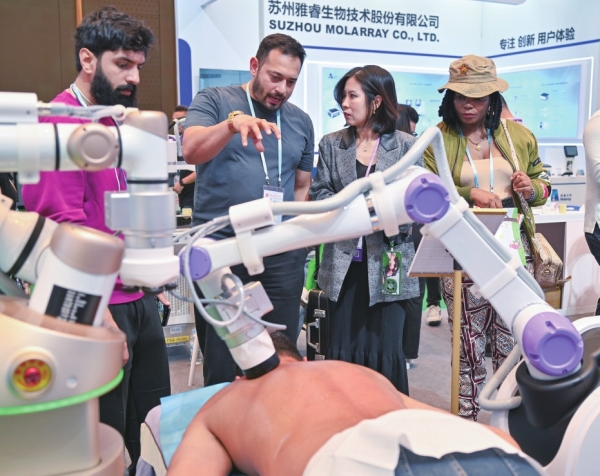 11月4日,第138届中国进出口商品交易会(广交会)于广州闭幕。本届展会共有超31万名境外采购商到会,创下历史新高。图为3日,客商在广交会展馆了解一款理疗机器人。