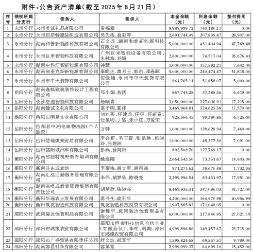 中国银行股份有限公司湖南省分行与中国东方资产管理股份有限公司湖南省分公司于2025年9月26日签订《不良资产批量转让协议》(编号:湘中银批转2025003号),中国银行股份有限公司湖南省分行(含辖属各分支行)将其对本公告附件“公告资产清单”所列借款人及其担保人享有的主债权、担保合同项下的全部权利及相关附属权益,依法转让给中国东方资产管理股份有限公司湖南省分公司。中国银行股份有限公司湖南省分行特公告通知各借款人、担保人以及因各种原因发生更名、改制、歇业、吊销营业执照或丧失民事主体资格等情况的相关承债主体或清算主体。