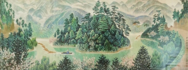 此后多年,他对湖南的艺术回馈从未间断。1996年,为“中国常德诗墙”绘制完成两幅各高2米、宽30米的石刻壁画《沅江春暖》《澧水花繁》;1999年,为平江县邮电局创作《深山邮情》;2000年,81岁高龄受邀到岳阳过春节,爽快答应创作,历时一年多为南湖宾馆留下《天下忧乐情满楼》《春风又绿盘石洲》两幅巨作;2006年,为平江画彩墨长卷《汨水平江永流芳》;2011年,应湖南驻京办之邀,创作壁画《长沙——橘子洲头》。