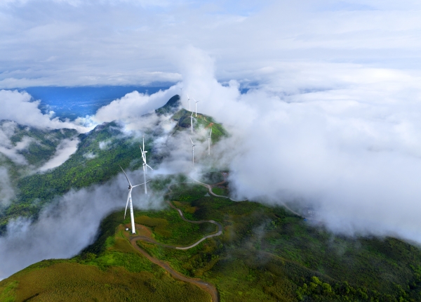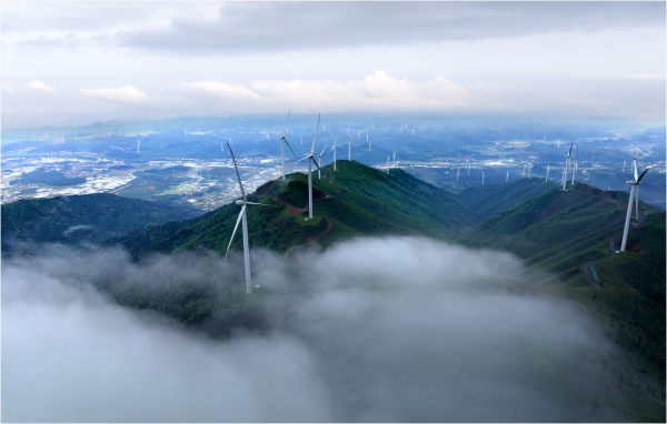 清晨,国电投五凌电力江永上江圩风电场云雾缭绕,一台台风力发电机高耸入云,与山顶自然风光构成一幅壮美的生态画卷。
