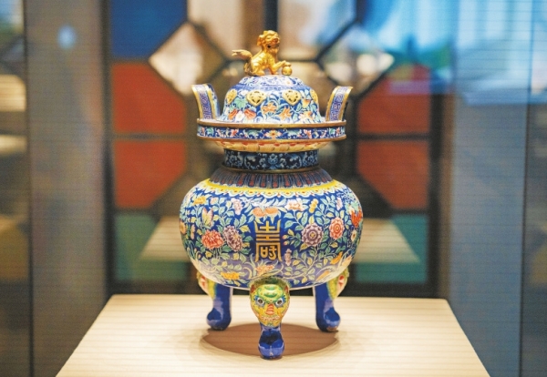 现场展示的铜胎画珐琅花蝶纹双喜寿字三足熏炉。