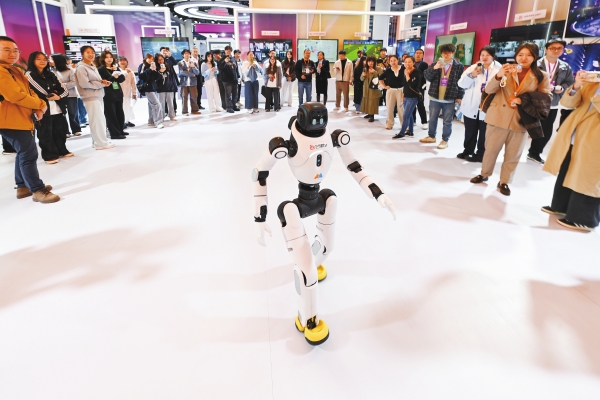 11月12日,湖南国际会展中心(芒果馆),观众与机器人互动。当天,2025中国新媒体技术展在长沙启幕。