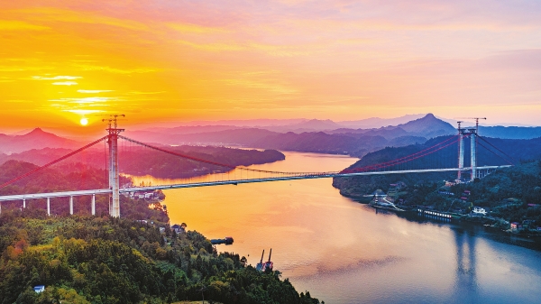 11月12日傍晚,位于沅陵县境内的G59张(家界)官(庄)高速控制性工程洞庭溪沅水特大桥进入桥面铺装阶段。该悬索桥主跨800米,为我省在建最大跨径悬索桥。